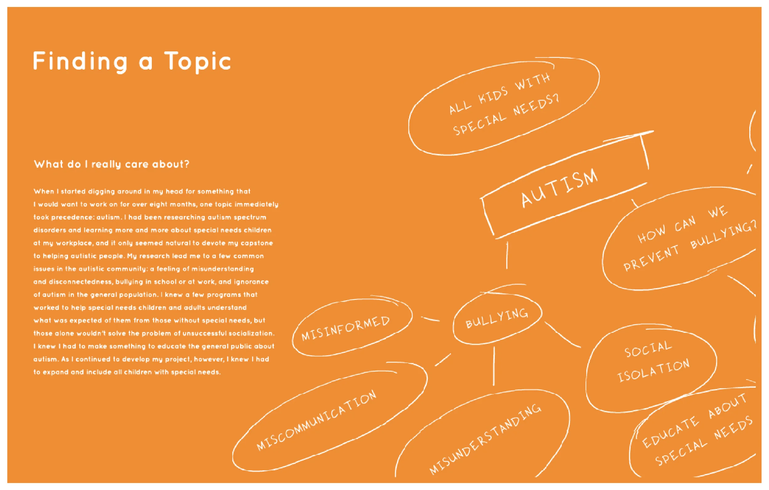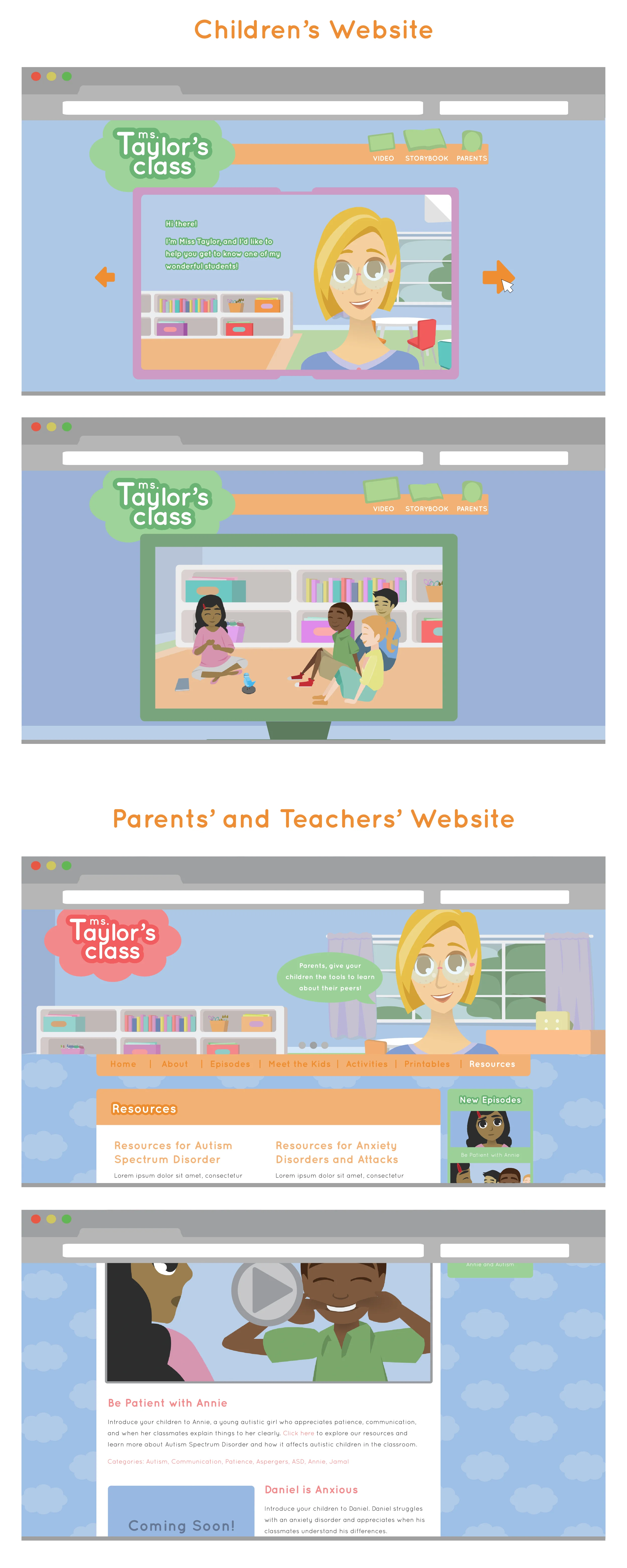 For my senior capstone project I wanted to focus on something that is very important to me personally: preventing bullying and spreading accurate knowledge about those with special needs. Over the course of a year I created Ms. Taylor's Class, a pitch for a series devoted to safely educating children about their special needs peers. The series would be featured on a web portal that would allow children and adults to explore each episode, read along with storybooks and fun activities, and learn about the experts that would help with the creation of every episode.